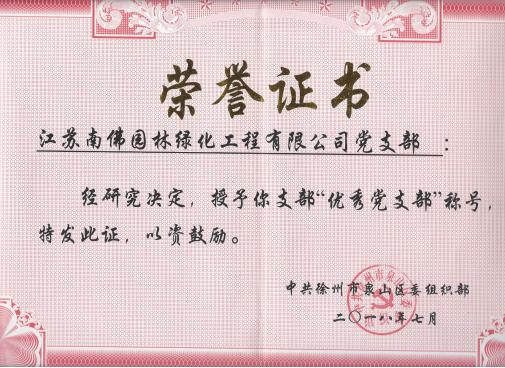 江苏南佛园林绿化工程有限公司在2018年度党建工作中成绩优异,业绩突出,荣获“优秀党支部”荣誉称号。