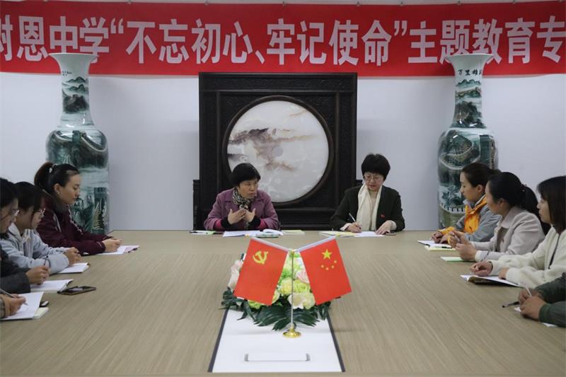党支部书记薛淑萍在发言中指出,按照市教育局和树恩集团“不忘初心、牢记使命”主题教育领导小组通知要求,学校作为第二批开展主题教育的单位,要把“能学的先学起来,能改的先改起来”。这次领导班子集体学习,既是领导干部带头开展主题教育的一项重要工作安排,也是为学校开展“不忘初心、牢记使命”主题教育统一思想、凝聚共识的思想准备会和动员会。